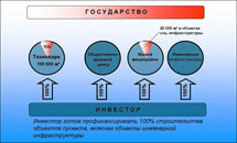 Инвестор готов профинансировать 100% строительства объектов проекта, включая объекты инженерной инфраструктуры. В этом случае в собственность государства переходит (согласно условиям конкурса) 10% площадей в Технопарке (10 тыс кв.м.) и 20 тыс кв.м. в объектах социальной инфраструктуры (см. рис. 1).